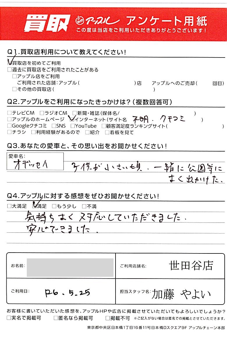 東京都世田谷区 アンケート用紙より T様 車名:ホンダ オデッセイ