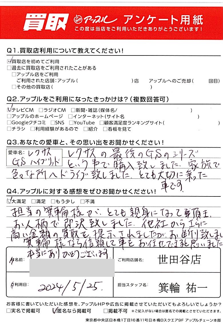 東京都文京区 アンケート用紙より I様 車名:レクサス GSハイブリッド (国内仕様 右H)