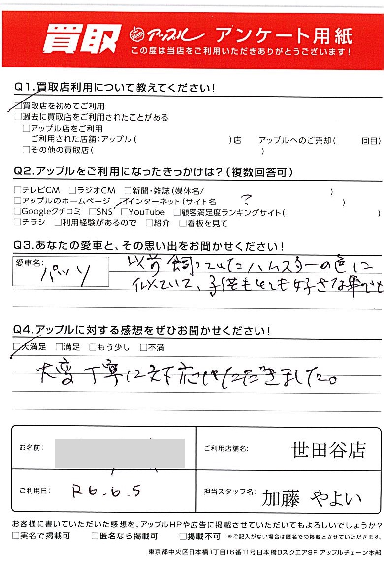 東京都世田谷区 アンケート用紙より K様 車名:トヨタ パッソ