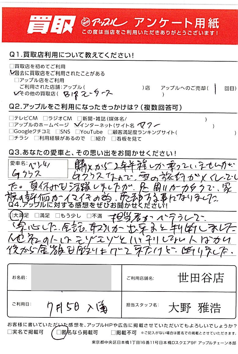 東京都渋谷区 アンケート用紙より N様 車名:メルセデス・ベンツ Gクラス