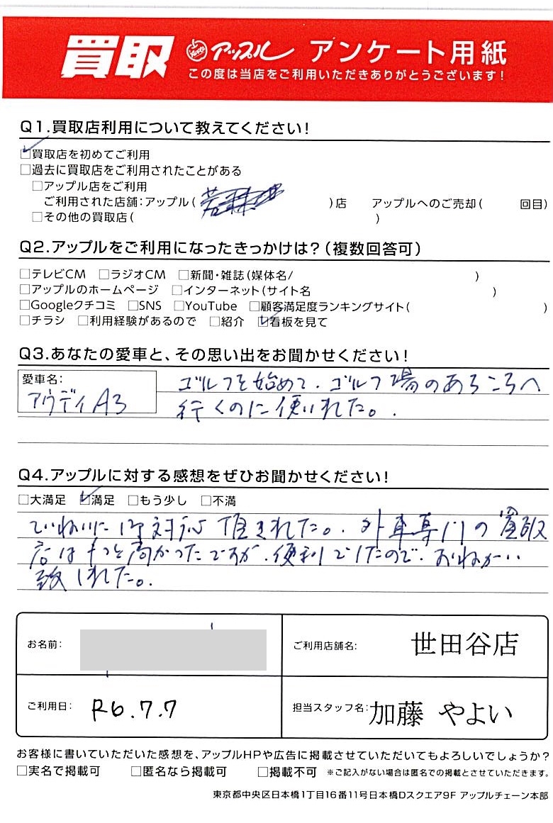 東京都世田谷区 アンケート用紙より K様 車名:アウディ A3