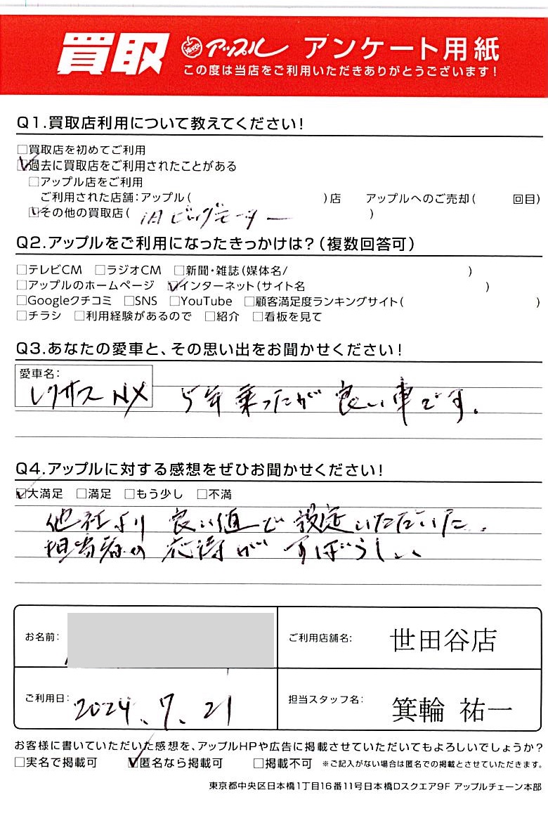 東京都世田谷区 アンケート用紙より S様 車名:レクサス NX (国内仕様 右H)