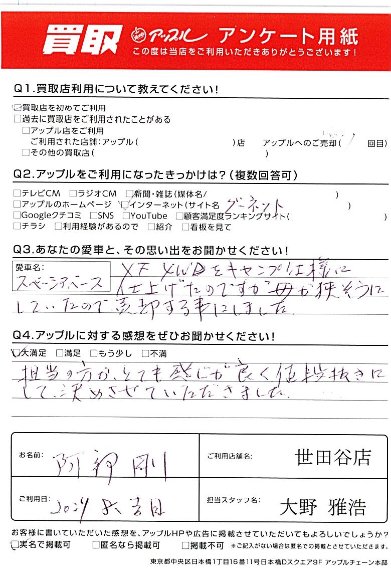 東京都世田谷区 アンケート用紙より 阿部 剛様 車名:スズキ スペーシアベース
