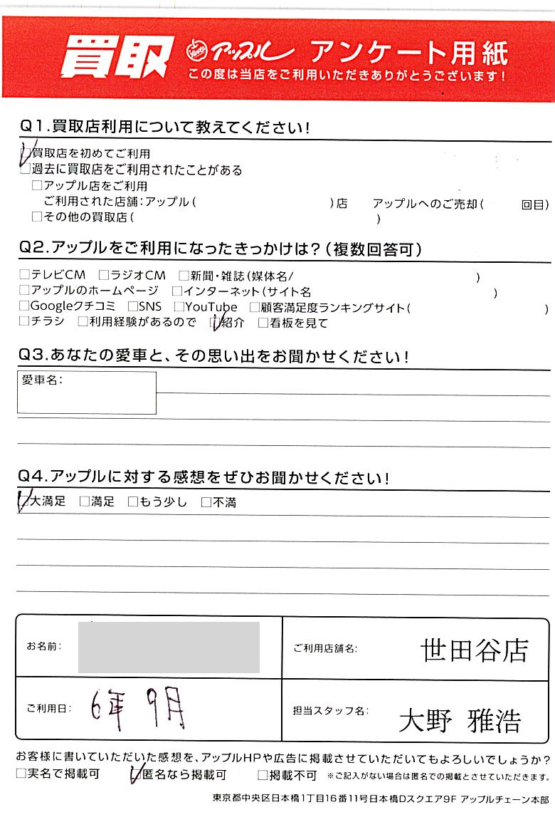 数あるお車買取店の中から、アップルを選んでいただき