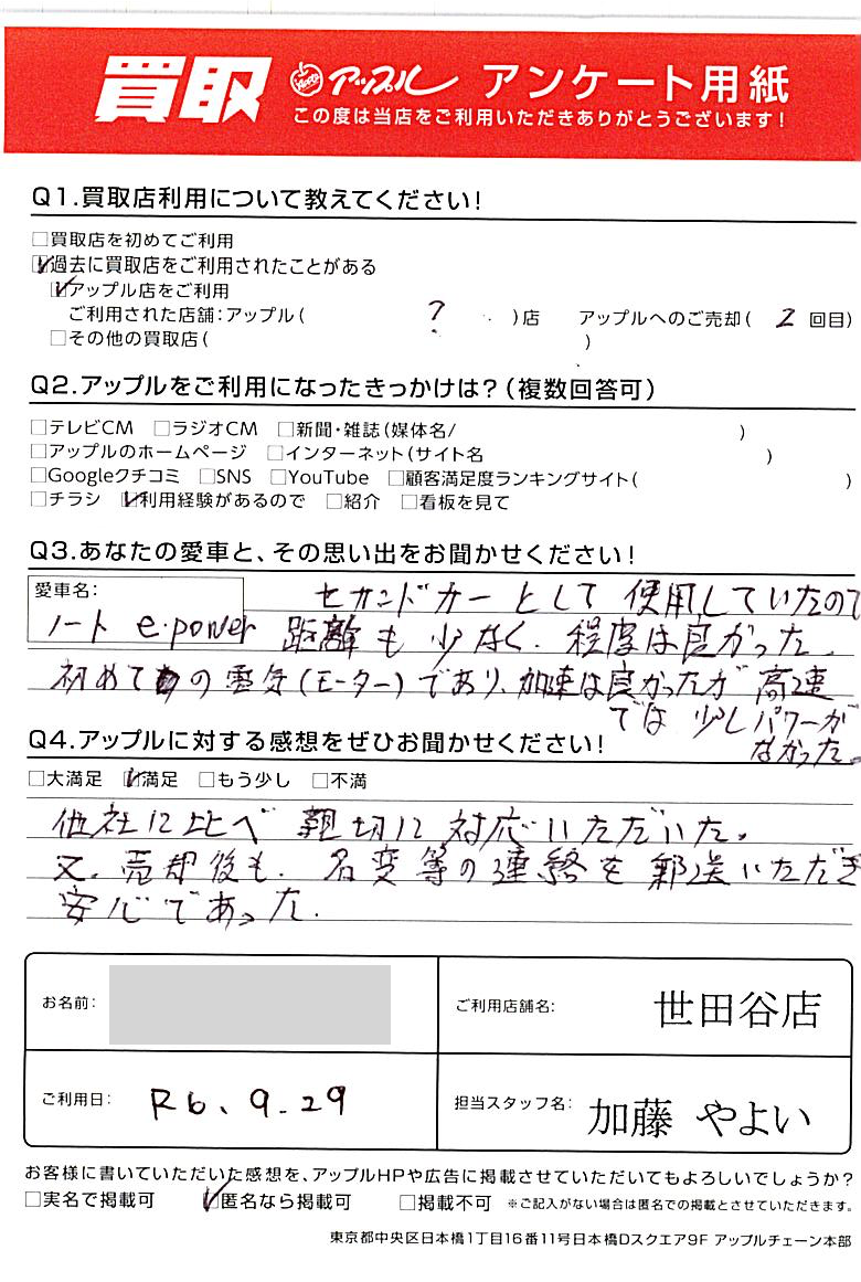 東京都杉並区 アンケート用紙より Y様 車名:日産 ノート