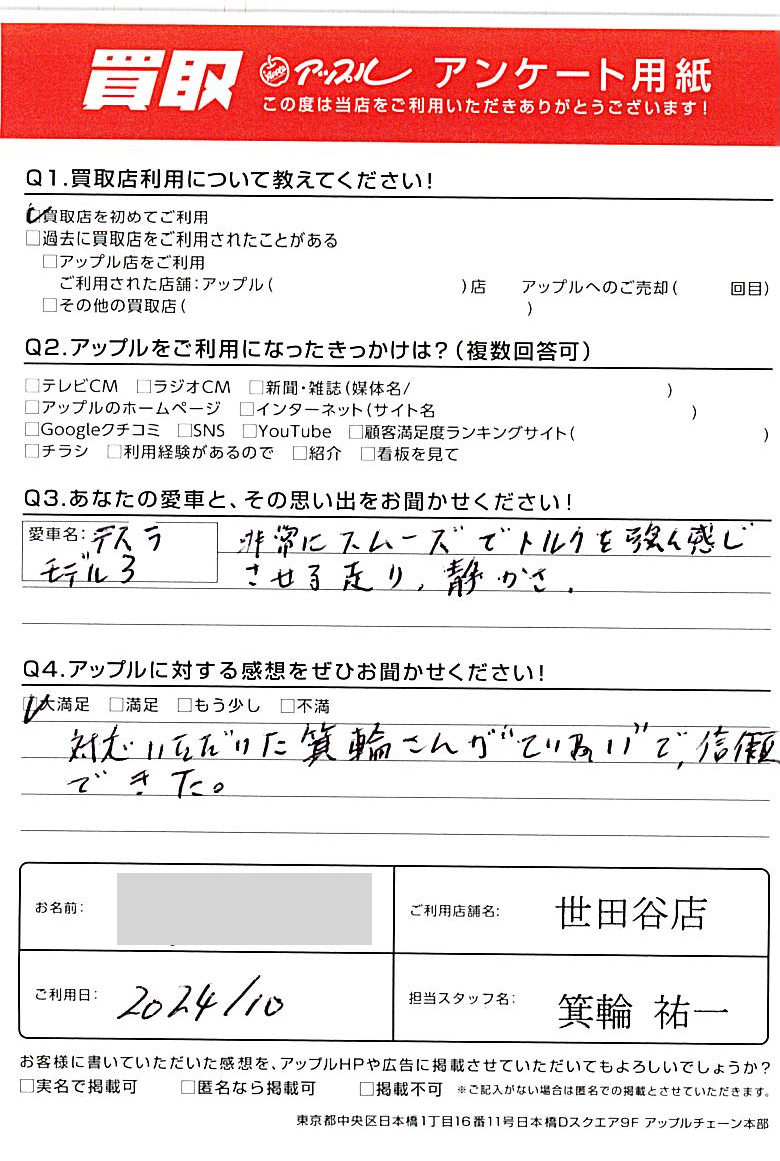 東京都渋谷区 アンケート用紙より Y様 車名:テスラ モデル3
