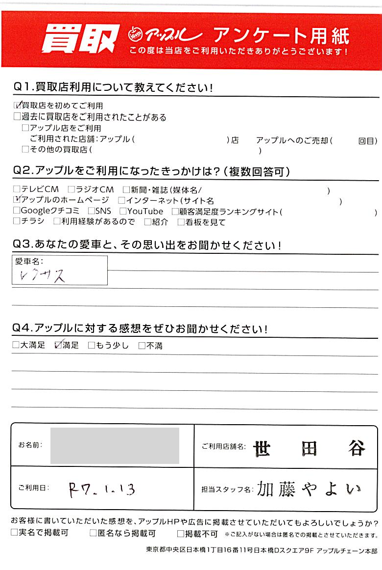 東京都世田谷区 アンケート用紙より様 車名:レクサス HS (国内仕様 右H)