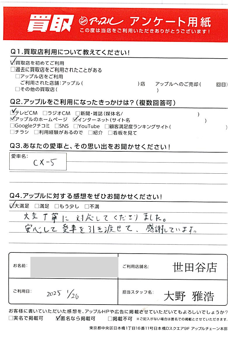 東京都大田区 アンケート用紙より T様 車名:マツダ CX-5