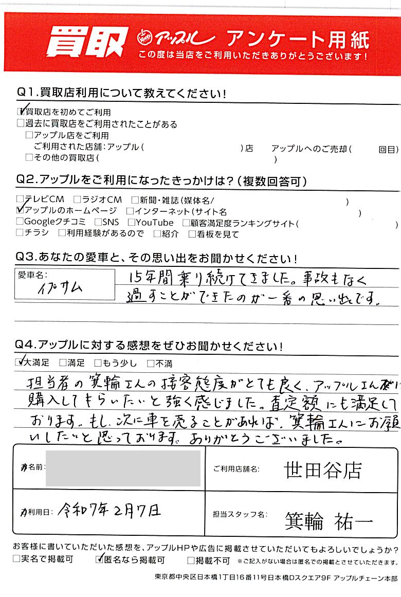 東京都杉並区 アンケート用紙より T様 車名:トヨタ イプサム