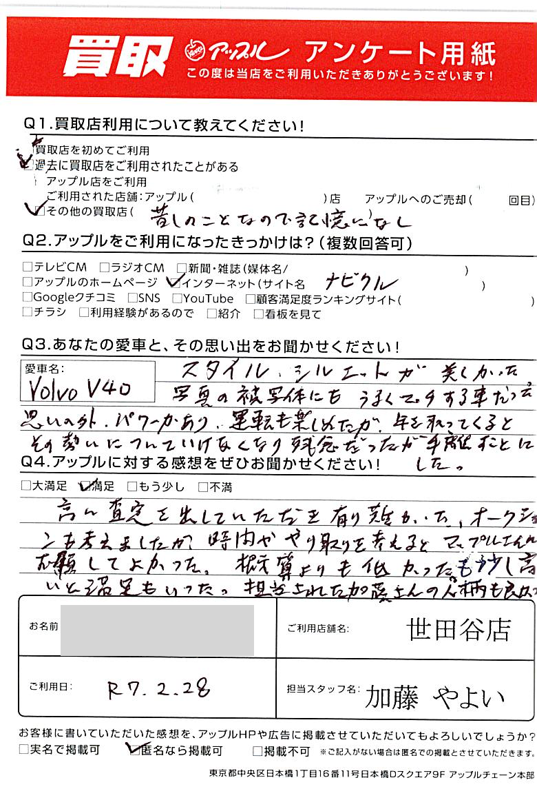 東京都調布市 アンケート用紙より U様 車名:ボルボ V40