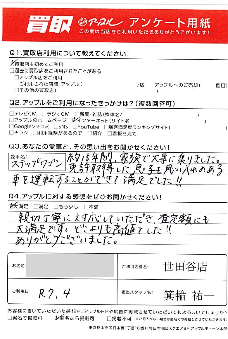 東京都渋谷区 アンケート用紙より N様 車名:ホンダ ステップワゴン