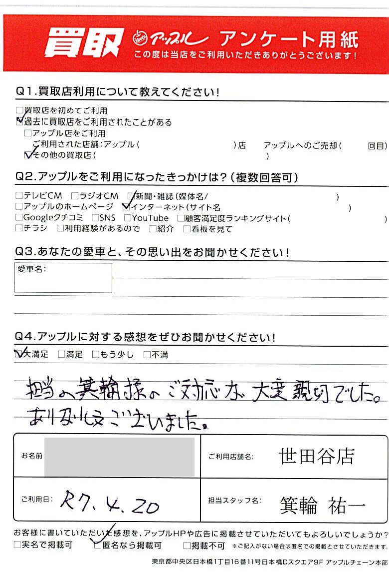 東京都目黒区 アンケート用紙より S様 車名:BMW 4シリーズグランクーペ