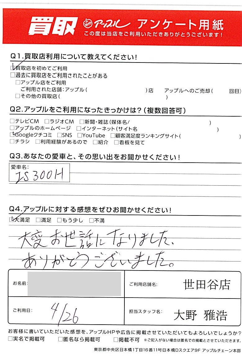 東京都杉並区 アンケート用紙より T様 車名:レクサス IS (国内仕様 右H)