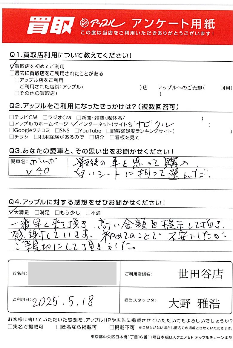 東京都世田谷区 アンケート用紙より K様 車名:ボルボ V40