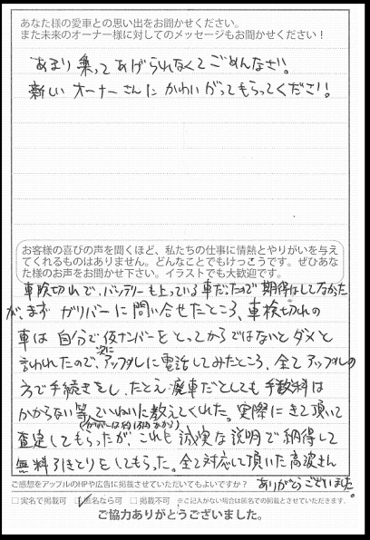 この度は大事な愛車を任せて頂き本当にありがとうございました。