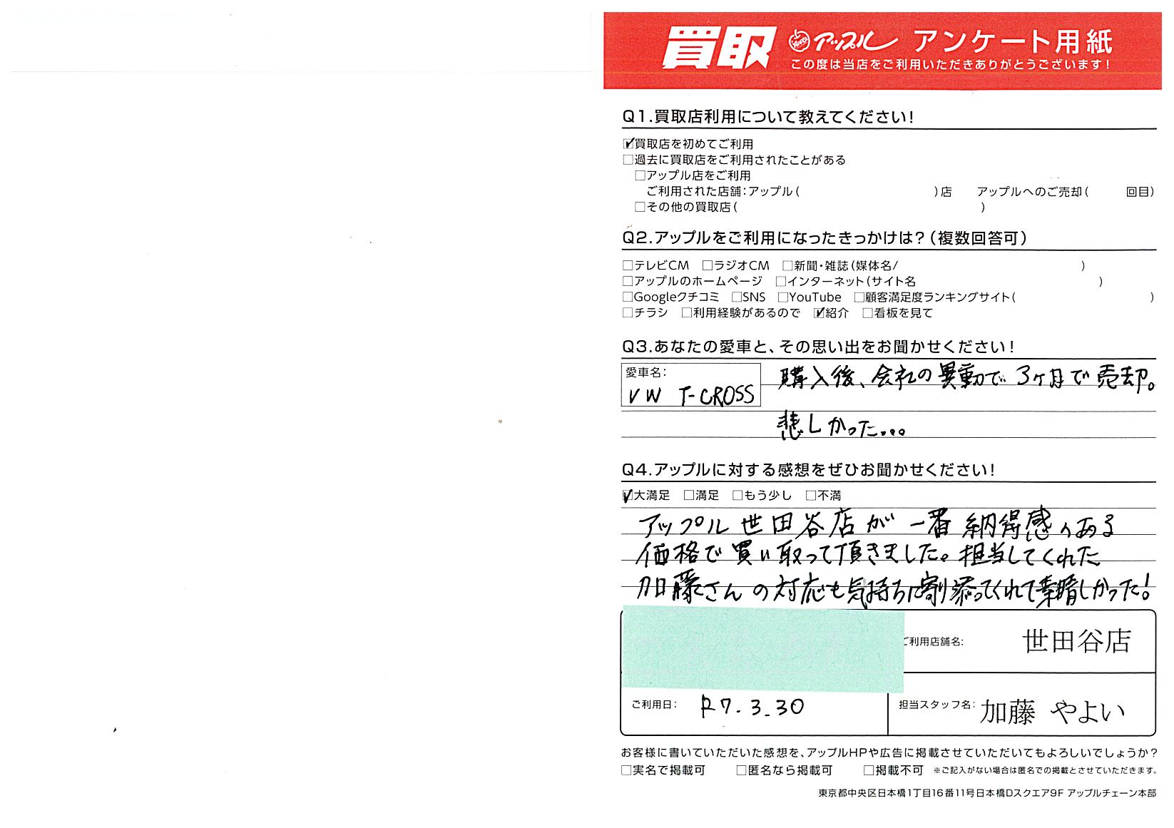 東京都三鷹市 アンケート用紙より O様 車名:フォルクスワーゲン T-Cross