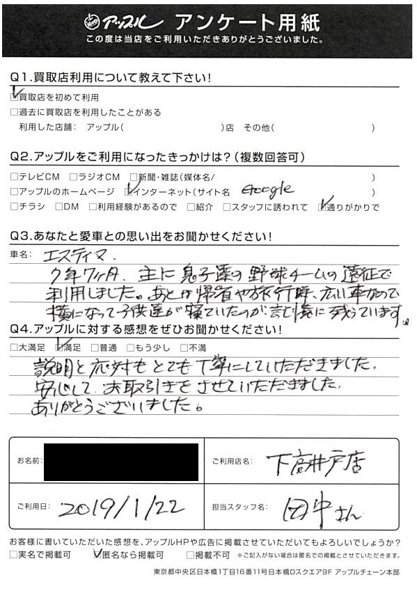 東京都世田谷区 S様 車名:トヨタ エスティマ
