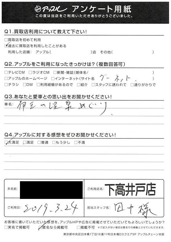 お車のご相談・ 査定だけでもOK! カンタン 入力 30秒 アップルがブランド買取始めました! お電話でも受付中! 受付時間10:00 ~ 19:00 0120-037-315 お車のご相談・ 査定だけでもOK! カンタン 入力 30秒 アップルがブランド買取始めました! お電話でも受付中! 受付時間10:00 ~ 19:00 0120-037-315 アップルがブランド買取始めました! お電話でも受付中! 受付時間10:00 ~ 19:00 0120-037-315 店舗情報 在庫車 スタッフ紹介 ブログ お客様の声 キャンペーン お得 無料査定 click お客様の声 ご記入日: 2019/03/24 東京都杉並区 Y様 車名:アウディ A3 Q あなたと愛車との思い出をお聞かせください! 伊豆の温泉めぐり 前へ 次へ お客様の声一覧を見る