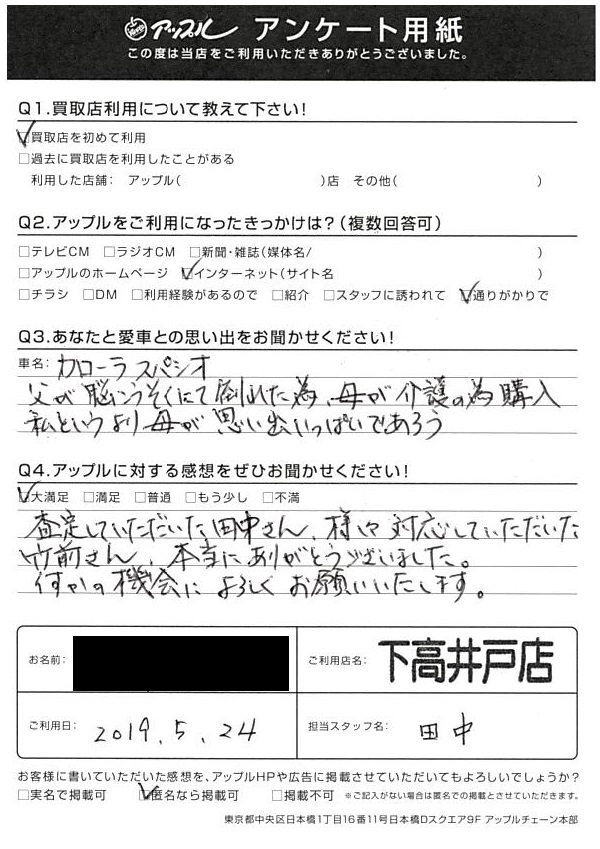 東京都杉並区 ご来店日:2019/5/24 Y様 車名:トヨタ カローラスパシオ スパシオ(カローラ)