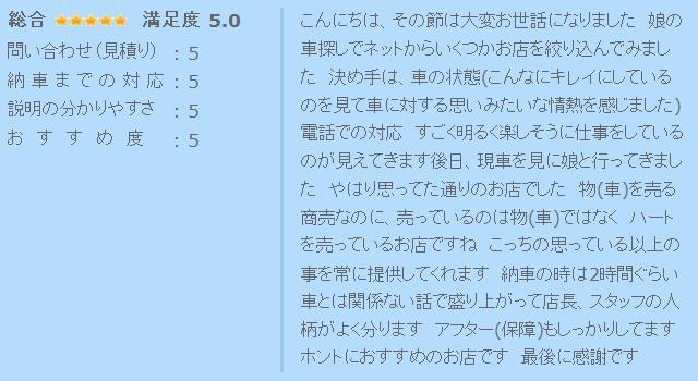 こんにちは、その節は大変お世話になりました 娘の車探しでネットからいくつかお店を絞り込んでみました 決め手は、車の状態(こんなにキレイにしているのを見て車に対する思いみたいな情熱を感じました) 電話での対応 すごく明るく楽しそうに仕事をしているのが見えてきます後日、現車を見に娘と行ってきました やはり思ってた通りのお店でした 物(車)を売る商売なのに、売っ…つづきをみるているのは物(車)ではなく ハートを売っているお店ですね こっちの思っている以上の事を常に提供してくれます 納車の時は2時間ぐらい車とは関係ない話で盛り上がって店長、スタッフの人柄がよく分ります アフター(保障)もしっかりしてます ホントにおすすめのお店です 最後に感謝です