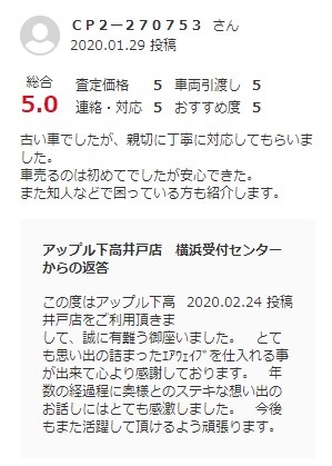 お車のご相談・ 査定だけでもOK! カンタン 入力 30秒 アップルがブランド買取始めました! お電話でも受付中! 受付時間10:00 ~ 19:00 0120-037-315 お車のご相談・ 査定だけでもOK! カンタン 入力 30秒 アップルがブランド買取始めました! お電話でも受付中! 受付時間10:00 ~ 19:00 0120-037-315 アップルがブランド買取始めました! お電話でも受付中! 受付時間10:00 ~ 19:00 0120-037-315 店舗情報 在庫車 スタッフ紹介 ブログ お客様の声 キャンペーン お得 無料査定 click お客様の声 ご記入日: 2020/01/29 東京都世田谷区 ご利用日:2020/1/19 A様 車名:ホンダ エアウェイブ グーネット買取より古い車でしたが、親切に丁寧に対応してもらいました。車売るのは初めてでしたが安心できた。また知人などで困っている方も紹介します。 前へ 次へ お客様の声一覧を見る