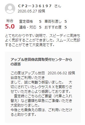 お車のご相談・ 査定だけでもOK! カンタン 入力 30秒 アップルがブランド買取始めました! お電話でも受付中! 受付時間10:00 ~ 19:00 0120-037-315 お車のご相談・ 査定だけでもOK! カンタン 入力 30秒 アップルがブランド買取始めました! お電話でも受付中! 受付時間10:00 ~ 19:00 0120-037-315 アップルがブランド買取始めました! お電話でも受付中! 受付時間10:00 ~ 19:00 0120-037-315 店舗情報 在庫車 スタッフ紹介 ブログ お客様の声 キャンペーン お得 無料査定 click お客様の声 ご記入日: 2020/05/27 東京都練馬区 ご利用日:2020/5/27 W様 車名:レクサス RXハイブリッド(国内仕様 H27年9月迄) グーネット買取よりとてもわかりやすい説明で、スピーディに気持ちよく売却することができました。スムーズに売却することができて大変満足です。 前へ 次へ お客様の声一覧を見る