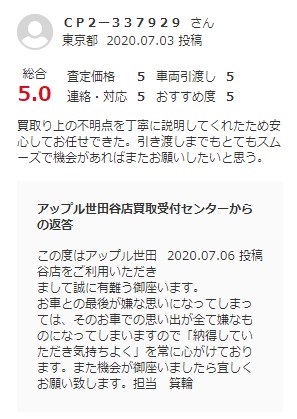 お車のご相談・ 査定だけでもOK! カンタン 入力 30秒 アップルがブランド買取始めました! お電話でも受付中! 受付時間10:00 ~ 19:00 0120-037-315 お車のご相談・ 査定だけでもOK! カンタン 入力 30秒 アップルがブランド買取始めました! お電話でも受付中! 受付時間10:00 ~ 19:00 0120-037-315 アップルがブランド買取始めました! お電話でも受付中! 受付時間10:00 ~ 19:00 0120-037-315 店舗情報 在庫車 スタッフ紹介 ブログ お客様の声 キャンペーン お得 無料査定 click お客様の声 ご記入日: 2020/07/03 東京都世田谷区 ご利用日:2020/6/24 T様 車名:日産 キャラバン グーネット買取より買取り上の不明点を丁寧に説明してくれたため安心してお任せできた。引き渡しまでもとてもスムーズで機会があればまたお願いしたいと思う。 前へ 次へ お客様の声一覧を見る