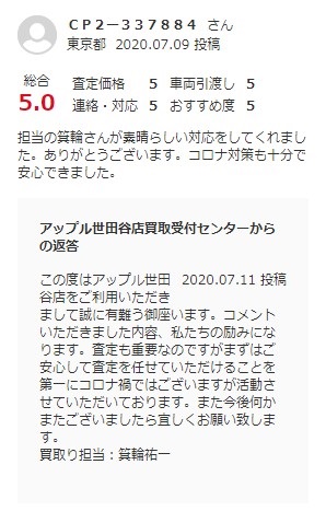 お車のご相談・ 査定だけでもOK! カンタン 入力 30秒 アップルがブランド買取始めました! お電話でも受付中! 受付時間10:00 ~ 19:00 0120-037-315 お車のご相談・ 査定だけでもOK! カンタン 入力 30秒 アップルがブランド買取始めました! お電話でも受付中! 受付時間10:00 ~ 19:00 0120-037-315 アップルがブランド買取始めました! お電話でも受付中! 受付時間10:00 ~ 19:00 0120-037-315 店舗情報 在庫車 スタッフ紹介 ブログ お客様の声 キャンペーン お得 無料査定 click お客様の声 ご記入日: 2020/07/09 東京都渋谷区 ご利用日:2020/7/1 I様 車名:トヨタ パッソ グーネット買取より担当の箕輪さんが素晴らしい対応をしてくれました。ありがとうございます。コロナ対策も十分で安心できました。 前へ 次へ お客様の声一覧を見る