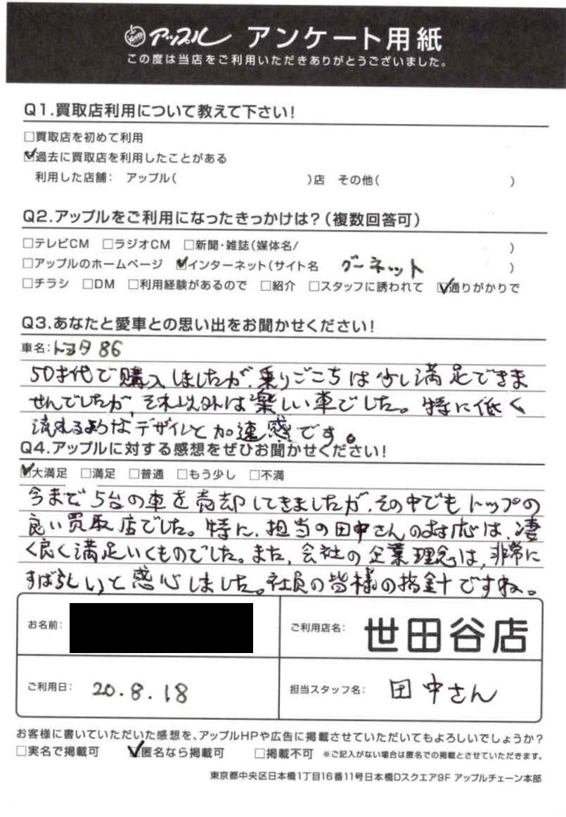 東京都目黒区 ご利用日:2020/8/18 Y様 車名:トヨタ 86