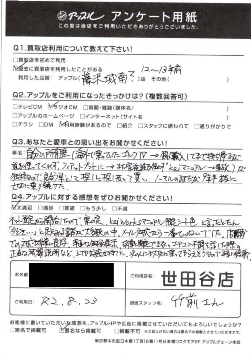 東京都世田谷区 ご利用日:2020/8/23 S様 車名:スズキ Kei