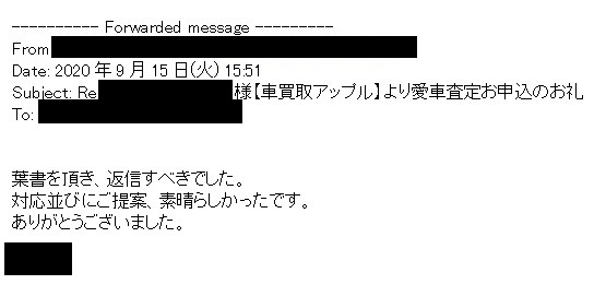 お車のご相談・ 査定だけでもOK! カンタン 入力 30秒 アップルがブランド買取始めました! お電話でも受付中! 受付時間10:00 ~ 19:00 0120-037-315 お車のご相談・ 査定だけでもOK! カンタン 入力 30秒 アップルがブランド買取始めました! お電話でも受付中! 受付時間10:00 ~ 19:00 0120-037-315 アップルがブランド買取始めました! お電話でも受付中! 受付時間10:00 ~ 19:00 0120-037-315 店舗情報 在庫車 スタッフ紹介 ブログ お客様の声 キャンペーン お得 無料査定 click お客様の声 ご記入日: 2020/10/28 東京都世田谷区 ご利用日:2020/8/23 H様 車名:トヨタ ヴォクシー アップル本部へのメール返信より葉書を頂き、返信すべきでした。対応並びにご提案、素晴らしかったです。ありがとうございました。 前へ 次へ お客様の声一覧を見る