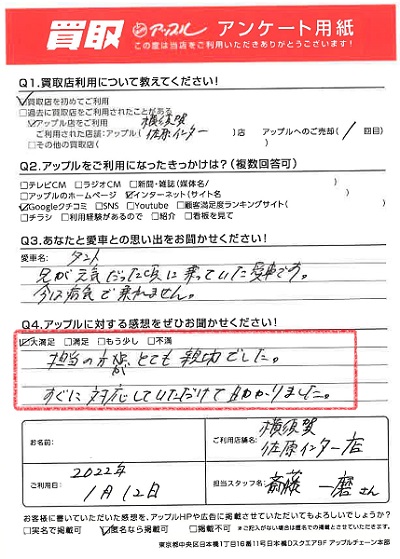 お車のご相談・ 査定だけでもOK! カンタン 入力 30秒 アップルがブランド買取始めました! お電話でも受付中! 受付時間9:30 ~ 18:30 046-833-8881 お車のご相談・ 査定だけでもOK! カンタン 入力 30秒 アップルがブランド買取始めました! お電話でも受付中! 受付時間9:30 ~ 18:30 046-833-8881 アップルがブランド買取始めました! お電話でも受付中! 受付時間9:30 ~ 18:30 046-833-8881 店舗情報 在庫車 スタッフ紹介 ブログ お客様の声 キャンペーン お得 無料査定 click お客様の声 ご記入日: 2022/01/12 I様 車名:ダイハツ タント 満足度★★★★★担当の方がとても親切でした。すぐに対応していただけて助かりました。 前へ 次へ お客様の声一覧を見る