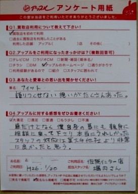 お車のご相談・ 査定だけでもOK! カンタン 入力 30秒 アップルがブランド買取始めました! お電話でも受付中! 受付時間9:30 ~ 18:30 046-833-8881 お車のご相談・ 査定だけでもOK! カンタン 入力 30秒 アップルがブランド買取始めました! お電話でも受付中! 受付時間9:30 ~ 18:30 046-833-8881 アップルがブランド買取始めました! お電話でも受付中! 受付時間9:30 ~ 18:30 046-833-8881 店舗情報 在庫車 スタッフ紹介 ブログ お客様の声 キャンペーン お得 無料査定 click お客様の声 ご記入日: 2014/08/10 ササキ様 ■ご利用日時■ H26年1月20日■車種■ホンダ フィット■担当者■ 堀内【アップルに対する感想をぜひお書きください】満足度★★★★★車だけではなく、僕自身の事にも親身に相談に乗って下さり本当にうれしかった。スタッフの対応は某大手他社より非常に良かったと思う。 前へ 次へ お客様の声一覧を見る