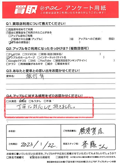 お車のご相談・ 査定だけでもOK! カンタン 入力 30秒 アップルがブランド買取始めました! お電話でも受付中! 受付時間9:30 ~ 18:30 046-833-8881 お車のご相談・ 査定だけでもOK! カンタン 入力 30秒 アップルがブランド買取始めました! お電話でも受付中! 受付時間9:30 ~ 18:30 046-833-8881 アップルがブランド買取始めました! お電話でも受付中! 受付時間9:30 ~ 18:30 046-833-8881 店舗情報 在庫車 スタッフ紹介 ブログ お客様の声 キャンペーン お得 無料査定 click お客様の声 ご記入日: 2023/01/22 Y様 車名:ホンダ CR-Z 満足度★★★★丁寧に対応して頂きました。 前へ 次へ お客様の声一覧を見る