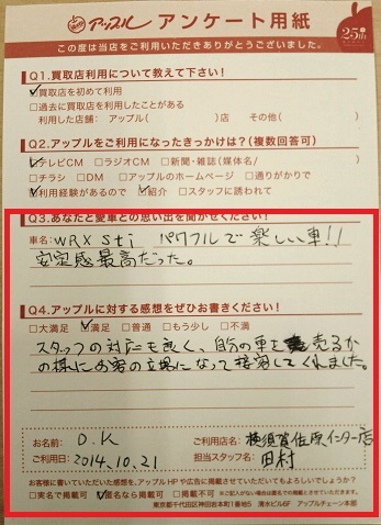 お車のご相談・ 査定だけでもOK! カンタン 入力 30秒 アップルがブランド買取始めました! お電話でも受付中! 受付時間9:30 ~ 18:30 046-833-8881 お車のご相談・ 査定だけでもOK! カンタン 入力 30秒 アップルがブランド買取始めました! お電話でも受付中! 受付時間9:30 ~ 18:30 046-833-8881 アップルがブランド買取始めました! お電話でも受付中! 受付時間9:30 ~ 18:30 046-833-8881 店舗情報 在庫車 スタッフ紹介 ブログ お客様の声 キャンペーン お得 無料査定 click お客様の声 ご記入日: 2014/10/21 O・K様 ■ご利用日時■ H26年10月21日■車種■ WRX Sti■担当者■ 田村【アップルに対する感想をぜひお書きください】満足度★★★★スタッフの対応も良く自分の車を売るかの様にお客の立場になって接客してくれました。 前へ 次へ お客様の声一覧を見る