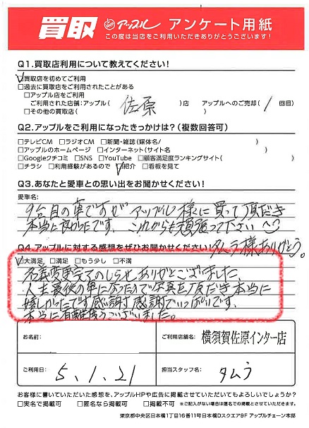 お車のご相談・ 査定だけでもOK! カンタン 入力 30秒 アップルがブランド買取始めました! お電話でも受付中! 受付時間9:30 ~ 18:30 046-833-8881 お車のご相談・ 査定だけでもOK! カンタン 入力 30秒 アップルがブランド買取始めました! お電話でも受付中! 受付時間9:30 ~ 18:30 046-833-8881 アップルがブランド買取始めました! お電話でも受付中! 受付時間9:30 ~ 18:30 046-833-8881 店舗情報 在庫車 スタッフ紹介 ブログ お客様の声 キャンペーン お得 無料査定 click お客様の声 ご記入日: 2023/01/21 H様 車名:日産 デイズ 満足度★★★★★名義変更完了のしらせありがとうございました。人生最後の車になったので、写真をいただき本当に嬉しかったです。感謝感謝でいっぱいです。本当に有り難うございました。 前へ 次へ お客様の声一覧を見る