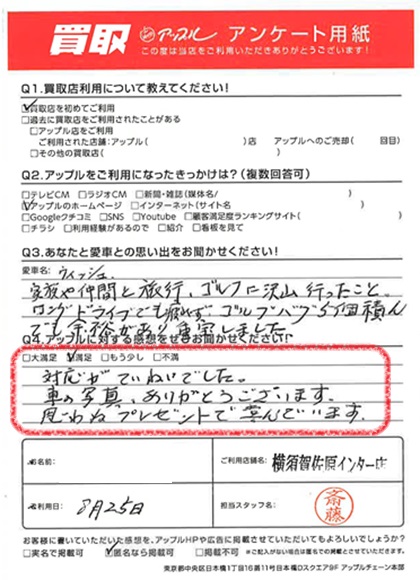お車のご相談・ 査定だけでもOK! カンタン 入力 30秒 アップルがブランド買取始めました! お電話でも受付中! 受付時間9:30 ~ 18:30 046-833-8881 お車のご相談・ 査定だけでもOK! カンタン 入力 30秒 アップルがブランド買取始めました! お電話でも受付中! 受付時間9:30 ~ 18:30 046-833-8881 アップルがブランド買取始めました! お電話でも受付中! 受付時間9:30 ~ 18:30 046-833-8881 店舗情報 在庫車 スタッフ紹介 ブログ お客様の声 キャンペーン お得 無料査定 click お客様の声 ご記入日: 2023/08/25 K様 車名:トヨタ ウィッシュ 満足度★★★★対応がていねいでした。車の写真、ありがとうございます。思わぬプレゼントで喜んでいます。 前へ 次へ お客様の声一覧を見る