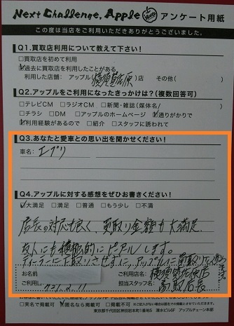 お車のご相談・ 査定だけでもOK! カンタン 入力 30秒 アップルがブランド買取始めました! お電話でも受付中! 受付時間9:30 ~ 18:30 046-833-8881 お車のご相談・ 査定だけでもOK! カンタン 入力 30秒 アップルがブランド買取始めました! お電話でも受付中! 受付時間9:30 ~ 18:30 046-833-8881 アップルがブランド買取始めました! お電話でも受付中! 受付時間9:30 ~ 18:30 046-833-8881 店舗情報 在庫車 スタッフ紹介 ブログ お客様の声 キャンペーン お得 無料査定 click お客様の声 ご記入日: 2015/02/11 M・Y様 ■ご利用日時■ H27年2月11日■車種■ エブリィ■担当者■ 高取店長【アップルに対する感想をぜひお書きください】満足度★★★★★店長の対応もよく買取金額も大満足友人にも積極的にピーアールします。ディーラーに下取りさせずに アップルに買取をすすめます 前へ 次へ お客様の声一覧を見る