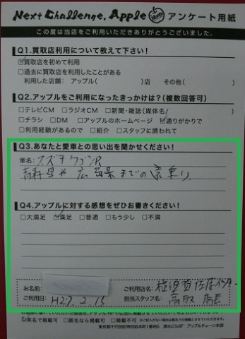 お車のご相談・ 査定だけでもOK! カンタン 入力 30秒 アップルがブランド買取始めました! お電話でも受付中! 受付時間9:30 ~ 18:30 046-833-8881 お車のご相談・ 査定だけでもOK! カンタン 入力 30秒 アップルがブランド買取始めました! お電話でも受付中! 受付時間9:30 ~ 18:30 046-833-8881 アップルがブランド買取始めました! お電話でも受付中! 受付時間9:30 ~ 18:30 046-833-8881 店舗情報 在庫車 スタッフ紹介 ブログ お客様の声 キャンペーン お得 無料査定 click お客様の声 ご記入日: 2015/02/15 M・O様 ■ご利用日時■ H27年2月15日■車種■ ワゴンR■担当者■ 高取店長【アップルに対する感想をぜひお書きください】満足度★★★★ 前へ 次へ お客様の声一覧を見る