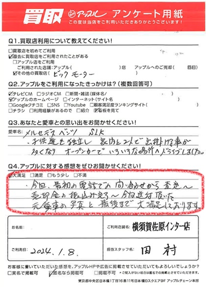 お車のご相談・ 査定だけでもOK! カンタン 入力 30秒 アップルがブランド買取始めました! お電話でも受付中! 受付時間9:30 ~ 18:30 046-833-8881 お車のご相談・ 査定だけでもOK! カンタン 入力 30秒 アップルがブランド買取始めました! お電話でも受付中! 受付時間9:30 ~ 18:30 046-833-8881 アップルがブランド買取始めました! お電話でも受付中! 受付時間9:30 ~ 18:30 046-833-8881 店舗情報 在庫車 スタッフ紹介 ブログ お客様の声 キャンペーン お得 無料査定 click お客様の声 ご記入日: 2024/01/08 O様 車名:メルセデス・ベンツ SLKクラス 満足度★★★★★ 今回、最初の電話での問い合わせから、査定~売却金の振込完了~今回送付頂いた元愛車の写真と、最後まで大満足しております。 前へ 次へ お客様の声一覧を見る