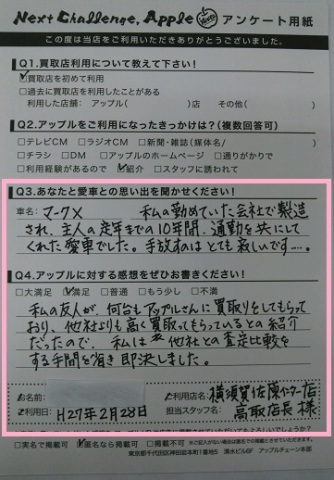 お車のご相談・ 査定だけでもOK! カンタン 入力 30秒 アップルがブランド買取始めました! お電話でも受付中! 受付時間9:30 ~ 18:30 046-833-8881 お車のご相談・ 査定だけでもOK! カンタン 入力 30秒 アップルがブランド買取始めました! お電話でも受付中! 受付時間9:30 ~ 18:30 046-833-8881 アップルがブランド買取始めました! お電話でも受付中! 受付時間9:30 ~ 18:30 046-833-8881 店舗情報 在庫車 スタッフ紹介 ブログ お客様の声 キャンペーン お得 無料査定 click お客様の声 ご記入日: 2015/02/28 W・S様 ■ご利用日時■ H27年2月28日■車種■ マークX■担当者■ 高取店長【アップルに対する感想をぜひお書きください】満足度★★★★私の友人が何台もアップルさんに買取をしてもらっており他社よりも高く買い取ってもらっているとの紹介だったので私は 他社との査定比較をする手間を省き即決しました。 前へ 次へ お客様の声一覧を見る