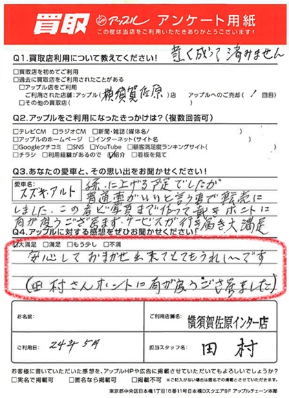 お車のご相談・ 査定だけでもOK! カンタン 入力 30秒 アップルがブランド買取始めました! お電話でも受付中! 受付時間9:30 ~ 18:30 046-833-8881 お車のご相談・ 査定だけでもOK! カンタン 入力 30秒 アップルがブランド買取始めました! お電話でも受付中! 受付時間9:30 ~ 18:30 046-833-8881 アップルがブランド買取始めました! お電話でも受付中! 受付時間9:30 ~ 18:30 046-833-8881 店舗情報 在庫車 スタッフ紹介 ブログ お客様の声 キャンペーン お得 無料査定 click お客様の声 ご記入日: 2024/05/31 W様 車名:スズキ アルト (2015年12月以降のワークス含む) 満足度★★★★★安心しておまかせ出来てとてもうれしいです。田村さんホントにありがとうございました。 前へ 次へ お客様の声一覧を見る