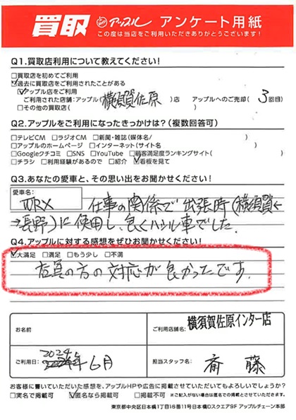 お車のご相談・ 査定だけでもOK! カンタン 入力 30秒 アップルがブランド買取始めました! お電話でも受付中! 受付時間9:30 ~ 18:30 046-833-8881 お車のご相談・ 査定だけでもOK! カンタン 入力 30秒 アップルがブランド買取始めました! お電話でも受付中! 受付時間9:30 ~ 18:30 046-833-8881 アップルがブランド買取始めました! お電話でも受付中! 受付時間9:30 ~ 18:30 046-833-8881 店舗情報 在庫車 スタッフ紹介 ブログ お客様の声 キャンペーン お得 無料査定 click お客様の声 ご記入日: 2024/06/21 S様 車名:スバル WRX (2021年11月~のWRX S4を除く) 満足度★★★★★店員の方の対応が良かったです。 前へ 次へ お客様の声一覧を見る