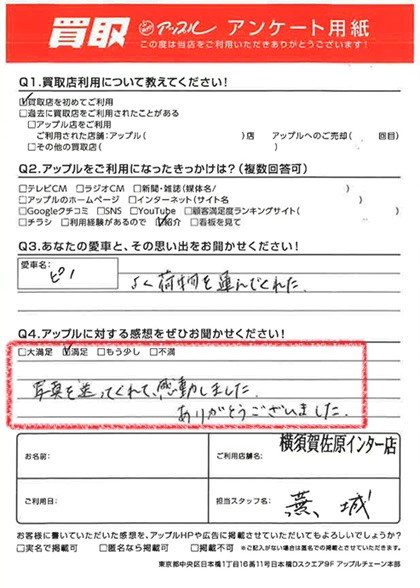 お車のご相談・ 査定だけでもOK! カンタン 入力 30秒 アップルがブランド買取始めました! お電話でも受付中! 受付時間9:30 ~ 18:30 046-833-8881 お車のご相談・ 査定だけでもOK! カンタン 入力 30秒 アップルがブランド買取始めました! お電話でも受付中! 受付時間9:30 ~ 18:30 046-833-8881 アップルがブランド買取始めました! お電話でも受付中! 受付時間9:30 ~ 18:30 046-833-8881 店舗情報 在庫車 スタッフ紹介 ブログ お客様の声 キャンペーン お得 無料査定 click お客様の声 ご記入日: 2024/09/21 K様 車名:日産 ピノ 満足度★★★★ 写真を送ってくれて感動しました。ありがとうございました。 前へ 次へ お客様の声一覧を見る