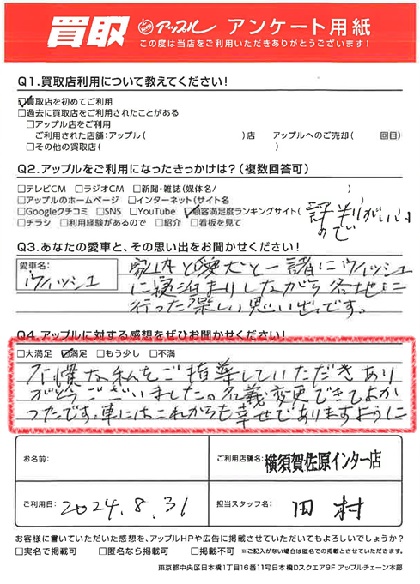 お車のご相談・ 査定だけでもOK! カンタン 入力 30秒 アップルがブランド買取始めました! お電話でも受付中! 受付時間9:30 ~ 18:30 046-833-8881 お車のご相談・ 査定だけでもOK! カンタン 入力 30秒 アップルがブランド買取始めました! お電話でも受付中! 受付時間9:30 ~ 18:30 046-833-8881 アップルがブランド買取始めました! お電話でも受付中! 受付時間9:30 ~ 18:30 046-833-8881 店舗情報 在庫車 スタッフ紹介 ブログ お客様の声 キャンペーン お得 無料査定 click お客様の声 ご記入日: 2024/08/31 A様 車名:トヨタ ウィッシュ 満足度★★★★不慣れな私をご指導していただきありがとうございました。名義変更できてよかったです。車にはこれからも幸せでありますように。 前へ 次へ お客様の声一覧を見る