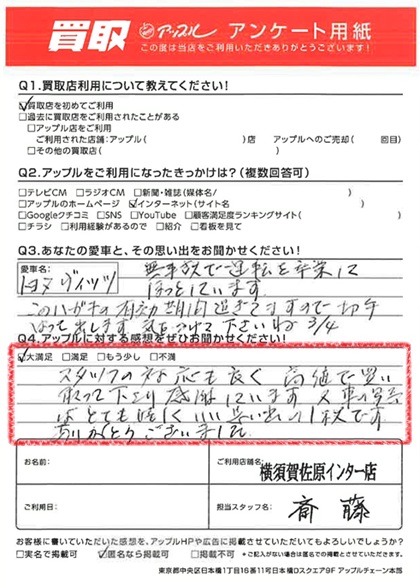 お車のご相談・ 査定だけでもOK! カンタン 入力 30秒 アップルがブランド買取始めました! お電話でも受付中! 受付時間9:30 ~ 18:30 046-833-8881 お車のご相談・ 査定だけでもOK! カンタン 入力 30秒 アップルがブランド買取始めました! お電話でも受付中! 受付時間9:30 ~ 18:30 046-833-8881 アップルがブランド買取始めました! お電話でも受付中! 受付時間9:30 ~ 18:30 046-833-8881 店舗情報 在庫車 スタッフ紹介 ブログ お客様の声 キャンペーン お得 無料査定 click お客様の声 ご記入日: 2024/11/14 W様 車名:トヨタ ヴィッツ 満足度★★★★★ スタッフの対応も良く、高値で買い取って下さり感謝しています。また、車の写真はとても嬉しく、いい思い出の1枚です。ありがとうございました。 前へ 次へ お客様の声一覧を見る
