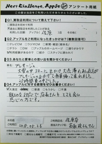 お車のご相談・ 査定だけでもOK! カンタン 入力 30秒 アップルがブランド買取始めました! お電話でも受付中! 受付時間9:30 ~ 18:30 046-833-8881 お車のご相談・ 査定だけでもOK! カンタン 入力 30秒 アップルがブランド買取始めました! お電話でも受付中! 受付時間9:30 ~ 18:30 046-833-8881 アップルがブランド買取始めました! お電話でも受付中! 受付時間9:30 ~ 18:30 046-833-8881 店舗情報 在庫車 スタッフ紹介 ブログ お客様の声 キャンペーン お得 無料査定 click お客様の声 ご記入日: 2015/05/26 I・M様 ■ご利用日時■ H27年5月26日■車種■ プレサージュ■担当者■ 高取【アップルに対する感想をぜひお書きください】満足度★★★★★親切な対応で店長さんもとても良い感じの方です。 前へ 次へ お客様の声一覧を見る