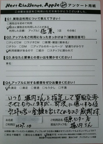 お車のご相談・ 査定だけでもOK! カンタン 入力 30秒 アップルがブランド買取始めました! お電話でも受付中! 受付時間9:30 ~ 18:30 046-833-8881 お車のご相談・ 査定だけでもOK! カンタン 入力 30秒 アップルがブランド買取始めました! お電話でも受付中! 受付時間9:30 ~ 18:30 046-833-8881 アップルがブランド買取始めました! お電話でも受付中! 受付時間9:30 ~ 18:30 046-833-8881 店舗情報 在庫車 スタッフ紹介 ブログ お客様の声 キャンペーン お得 無料査定 click お客様の声 ご記入日: 2015/10/24 F・K様 ■ご利用日時■ H27 年10月24日■車種■ プレミオ■担当者■ 堀内【アップルに対する感想をぜひお書きください】満足度★★★★★いつも堀内さんを指名して買取交渉させてもらいますが即決に値するくらい気持ち良い金額を出してくれるので感謝です。 前へ 次へ お客様の声一覧を見る