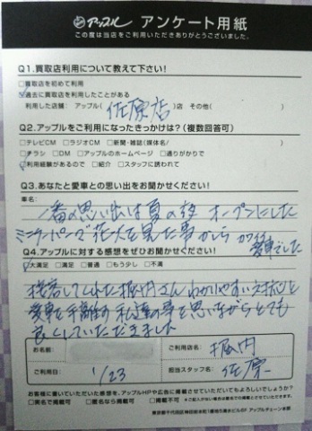 お車のご相談・ 査定だけでもOK! カンタン 入力 30秒 アップルがブランド買取始めました! お電話でも受付中! 受付時間9:30 ~ 18:30 046-833-8881 お車のご相談・ 査定だけでもOK! カンタン 入力 30秒 アップルがブランド買取始めました! お電話でも受付中! 受付時間9:30 ~ 18:30 046-833-8881 アップルがブランド買取始めました! お電話でも受付中! 受付時間9:30 ~ 18:30 046-833-8881 店舗情報 在庫車 スタッフ紹介 ブログ お客様の声 キャンペーン お得 無料査定 click お客様の声 ご記入日: 2016/01/23 N・M様 ■ご利用日時■ H28年1月23日■車種■ ミニクーパー■担当者■ 堀内【アップルに対する感想をぜひお書きください】満足度★★★★★接客してくれた堀内さん解りやすい対応と愛車を手離す私達の事を思いながらとてもよくしていただきました。 前へ 次へ お客様の声一覧を見る
