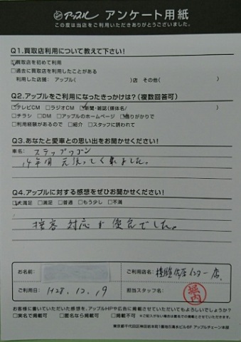 お車のご相談・ 査定だけでもOK! カンタン 入力 30秒 アップルがブランド買取始めました! お電話でも受付中! 受付時間9:30 ~ 18:30 046-833-8881 お車のご相談・ 査定だけでもOK! カンタン 入力 30秒 アップルがブランド買取始めました! お電話でも受付中! 受付時間9:30 ~ 18:30 046-833-8881 アップルがブランド買取始めました! お電話でも受付中! 受付時間9:30 ~ 18:30 046-833-8881 店舗情報 在庫車 スタッフ紹介 ブログ お客様の声 キャンペーン お得 無料査定 click お客様の声 ご記入日: 2016/12/19 M・T様 ■ご利用日時■ H28年12月19日■車種■ ステップW■担当者■ 堀内【アップルに対する感想をぜひお書きください】満足度★★★★★接客 対応が優良でした。 前へ 次へ お客様の声一覧を見る